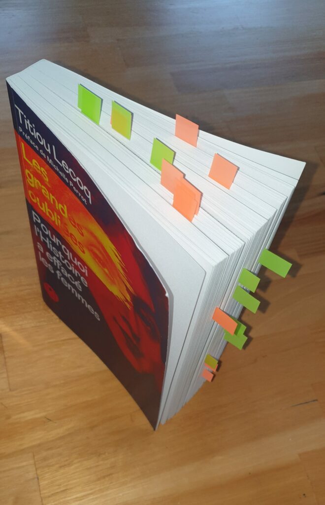 D’abord parce que c’est Titiou Lecoq et qu’elle raconte des choses très intéressantes sans te barber. Parce qu’elle a plein d’humour et que le ton de ses écrits est léger malgré la lourdeur de certains sujets traités. Parce qu’elle va t’apprendre plein de trucs incroyables et que tu vas aimer ça. J’ai orné ce livre d’une multitude de petits post-it pour y revenir et me souvenir. Et en particulier de ceci :