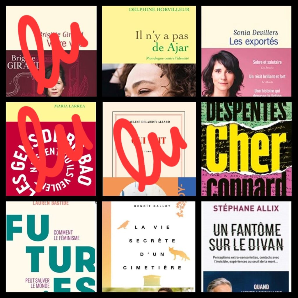 Je vous ai envoyé cette sélection mais je remets ça là. J’ai « Il n’y a pas de Ajar » vers moi. Marie va me prêter « Cher connard ». Camille, la libraire de Châteaugiron me prête des livres contre l’écriture de mes coups cœur qu’elle souhaite publier sur sa page Instagram. Elle m’a prêté « La vie clandestine » de Monica Sabolo » que j’ai aimé bof. Ainsi que « Qui sait » de Pauline Delabroy Allard qui faisait parti de ma sélection mais qui m’est tombé des mains à la 100ème page. Pauvre Camille, pas de retour coup de cœur donc sur ces deux livres, mais on va forcément se rattraper sur les suivants !
