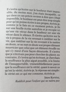 Et le livre se termine sur un extrait du kaddish pour l’enfant qui ne naîtra pas de Imre Kertész. Et là, Re-claque dans ma face tellement ce passage met en mot ce que je ressens depuis que je tente de pondre quelques lignes. Et quand tu te penches un peu sur le propos de ce livre, ça mets les poils et le coeur se fige.